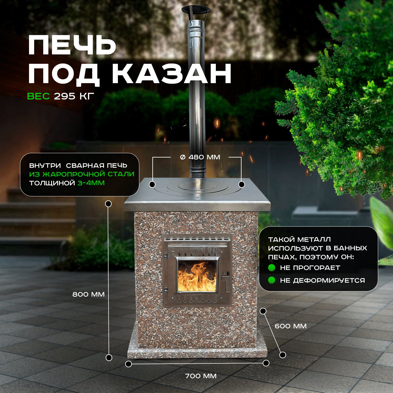 Комплекс включает печь под казан, разделочный стол, угловую печь барбекю (топка 55 см) и стол с мойкой, предлагая все необходимое для наслаждения приготовлением еды на открытом воздухе.
